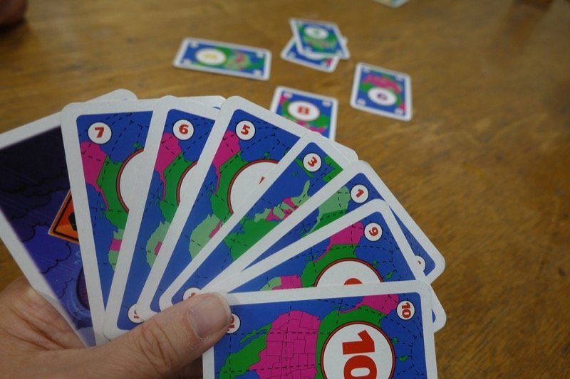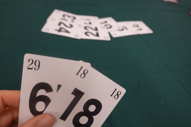 手札をなくすためには、ある程度は引き取りを利用して手札に連番を作りたいところですが、なかなかうまくいきません。特に今回は6人だったので連番があるのとないのではかなりの差があります。面白いと思いますが、次回は3−4人くらいで遊んでみたい。