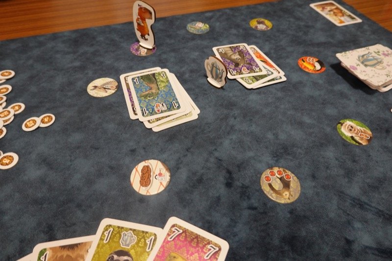 出すたびにそのスートの動物による特殊効果が発動します。もう1回手番を行ったり、カードを1枚山札から引いて1枚捨てたり(これによりカピバラが捨てられる)、左隣りのプレイヤーにカードを1枚渡したり(これによりカピバラを渡せる)、勝利点を捨てさせたり、防御となるティーポットを得たりできます。また場には円形状にカードと同じ効果のタイルが並べられており、カピバラのコマを時計回りに1−2マス動かしてその効果を発動するというものもあります。