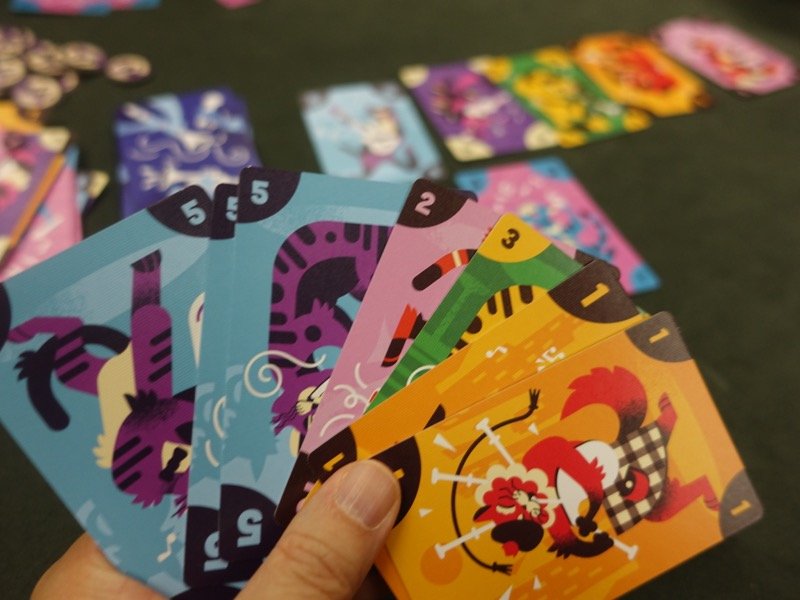 たかたさん持ち込みその2。3列だけの6ニムトで、それぞれ3、4、5枚でバーストする列を取りますが、取ったカードを1枚選び自分の前に並べていかなければなりません。残りは手札になります。自分の前に並べるのは1列だけで、これも昇順になっていなければなりません。できないときにはバーストとなり、ここで初めて失点になります。この2段階のバーストはなかなか面白いですね。