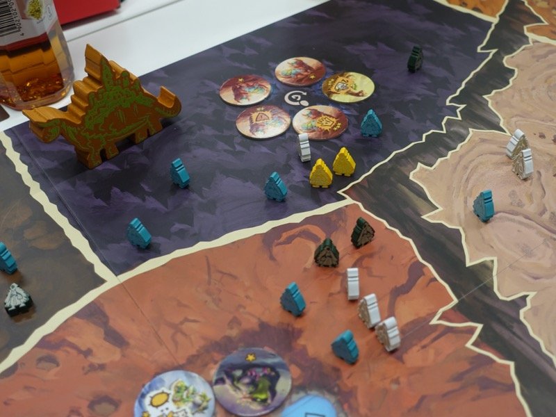 タイトルの「コロサス Colossus(複数形はコロッシ Colossi)」は巨人を表す言葉ですが、このゲームでは恐竜を表します。プレイヤーは3匹の恐竜の卵の獲得を目指して、恐竜に対応する3枚のボードでさまざまなアクションを行うのです。手番の最後に、アクションボードに対応した恐竜を1歩動かし、移動先のマスで恐竜は卵を産みます。卵が一定数になると決算となりプレイヤーのコマの数に応じて卵を取り合うのです。恐竜は他の恐竜がいるマスには動けないので、ある程度は決算のタイミングが予測できます。
