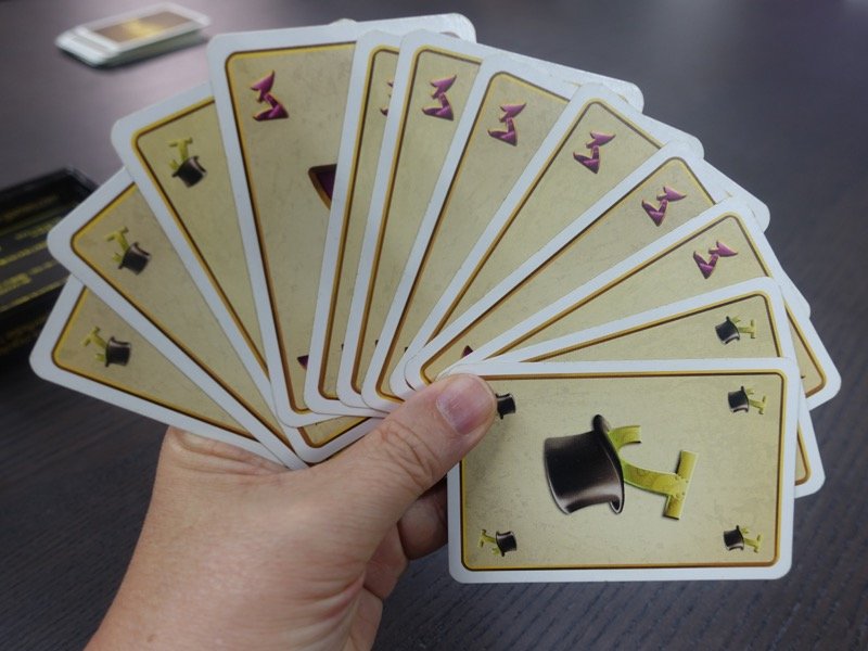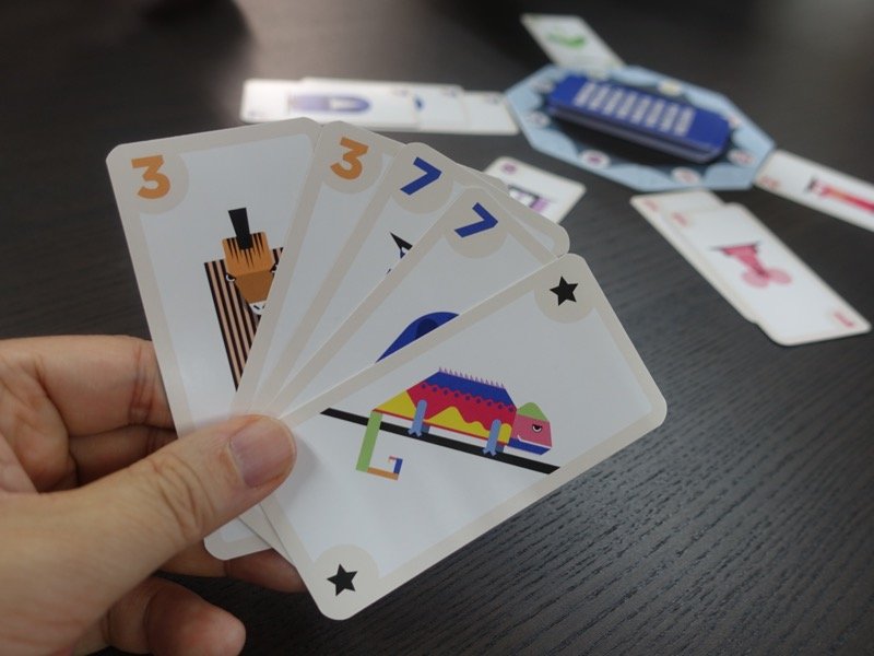 手軽なブラフゲームの傑作です。おそらくカードゲームの中では一番「ライアーズダイス」に感覚が似ているカードゲームだと思います。短いので2回遊んだのですが、2回目は終盤に向けて手札を3とジョーカーだけにしたら、なんと「3で6枚」と回ってくるではないですか。なのでただちに「3を12枚」と回して、手札を0にして久し振りに無失点を果たしました。