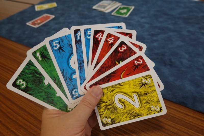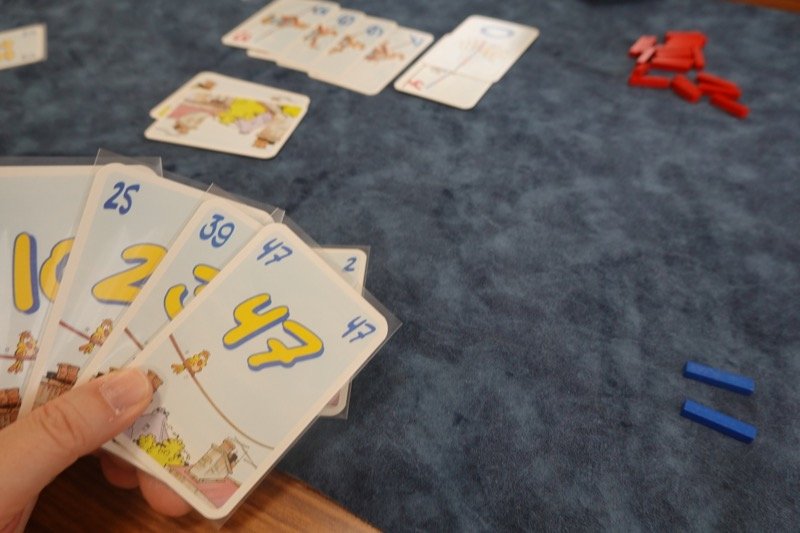「ラマ」を複雑にしたと言われている「カピバラクッキークラブ」です。場が2つあり場のカードの一つ上の数字を出します(同じ数字はダメ)。5のときは1が出せます。2つの場がどう数字ならなんでも出せます。