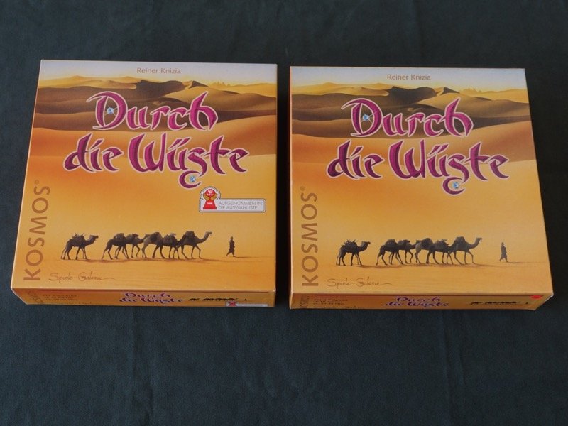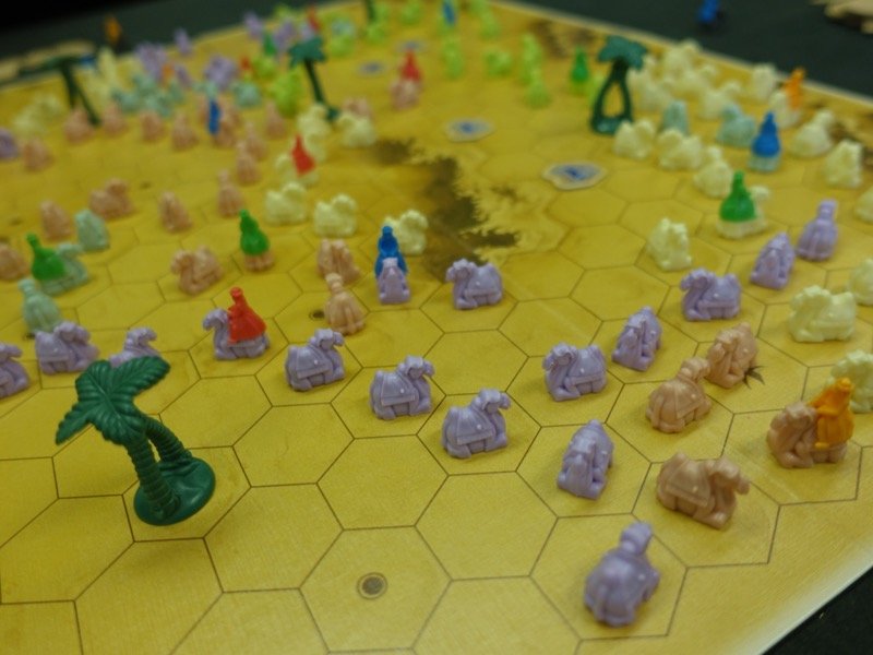 「砂漠を越えて」は前回のハンスイムグリュックの2作「チグリスユーフラテス」、「サムライ」とともにタイル配置3部作(陣取り3部作)と呼ばれることがあります。運のない完全情報ゲームで、プレイヤーは4-5色のキャラバン(らくだのグループ)を広げて、オアシスや水たまりの獲得や、囲った土地、キャラバンの大きさを競います。2-5人のどの人数でも良く、多人数囲碁といった趣があります。近年は川が描かれたボードや、各種の拡張があります。