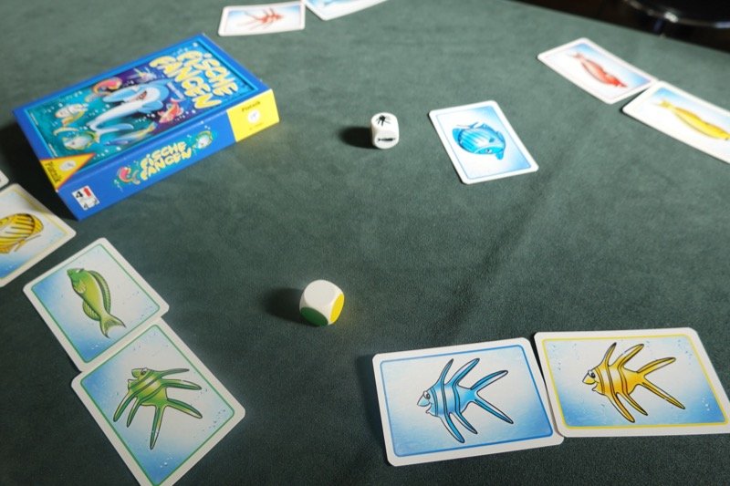 ぴーかんさんリクエストその2。2個のダイスを振って出た色と種類の組み合わせの魚カードを取ります。すでに他の人が持っていたらそれを奪います。色のダイスには矢印があり、これがでると該当する種類の魚をすべて中央の場に返却しなければなりません。選択の余地がない「バスに乗り降り」みたいなゲームですが、一喜一憂が楽しめて意外と悪くないです。