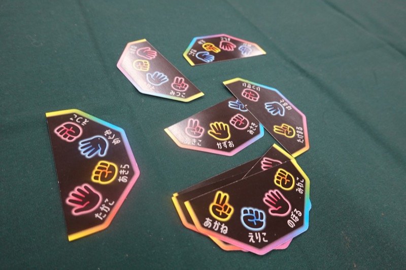 ゲーマーじゃんけんをそのままゲームにしたゲームです。ゲーマーじゃんけんとは、グーチョキパーのうち少数が勝つジャンケンで、2種が同数ならじゃんけんのルールで勝っている方が勝つというもので、大人数でも少ない回数で決まるのでよく使われている方法です。カードにはグーチョキパーとそれらを出した人の名前が書かれています。カードがめくられたら、勝っている人の名前をいち早く宣言します。複数が勝っていたらその種類(グーチョキパー)を宣言します。あいこだと、さらにカードをめくって追加します。