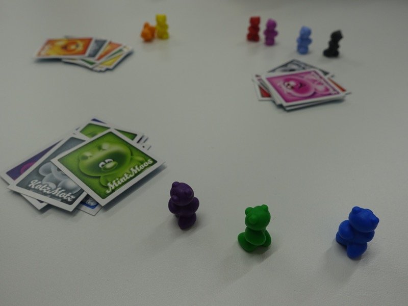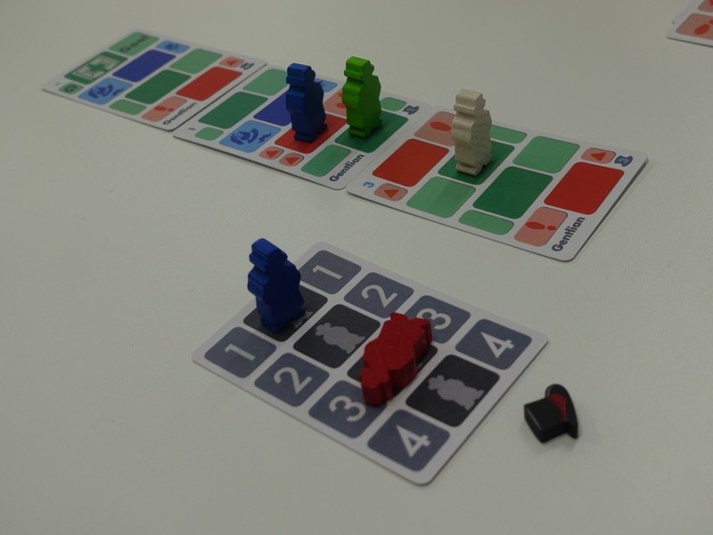 アブストラクト(運の要素がない)レースゲームです。ゲームマーケットは売り切れだったので、このシリーズの中では唯一買い損なったゲームということもあり、ねいじまさんが気を利かせて持ってきてくれました。最終的な点数はレースでの順位、集めたレーストラックカード、帽子トークンの所有によって決められます。手番はレーストラック上で一番後ろのプレイヤーからです。移動する歩数(1−4)を示すボードに自分のコマを置き(3人ならばそのときにもう一つの歩数マスをブロックします)、その数だけ移動します。面白いのは、その次のプレイヤーからは自分のコマを動かさなくても良いということです。他のプレイヤーのコマを動かすときにはそのプレイヤーに対応した歩数を動かし、帽子トークンを受け取ります。帽子トークンを持っている間は他のプレイヤーのコマを動かせませんが、自分のコマを動かせば返却できます。