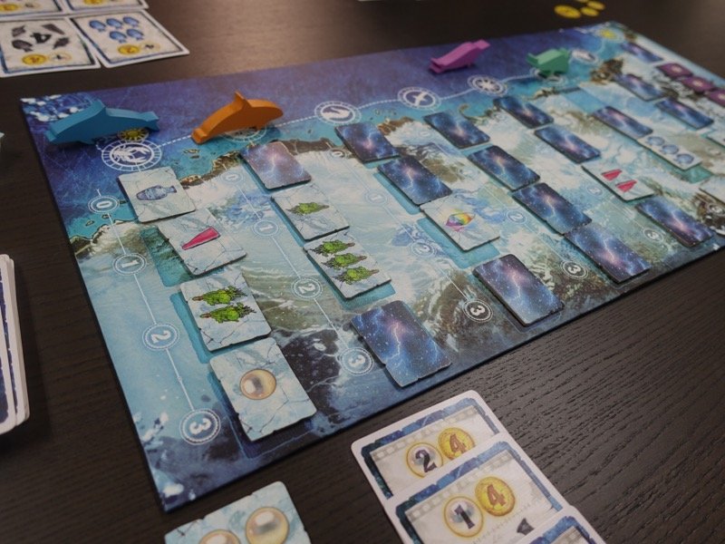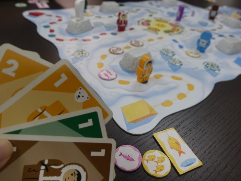 見栄えが良くてとっつきやすいゲーム、と思って持ってきたのがこの「ゴーゴーエスキモー」です。なんといってもエスキモーのコマ(もふもふ付き)や白熊のお尻が可愛い! しかしゲームはシビアで、自分の思い通りとタイミングでラウンドが終わらず、このゲームで久し振りに最下位になってしまいました。