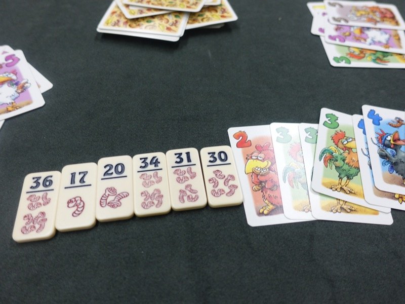 卓が6人になったので、6人でできる「ヘックメックカードゲーム」です。ちょっと久し振りでしたが、ルールは覚えていました。結構タイルを取ったり取られたりがあって盛り上がります。ちょっと足し算が面倒なところもあるので、「ヘックメックジュニア」のように1と2だけを使った「ヘックメックジュニアカードゲーム」などがあっても良いかもしれません。1点差の僅差で1位を取れて嬉しい。