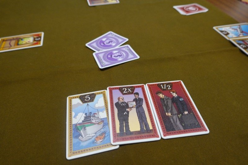 6人で遊べるファミリーゲームということで、自分が持ち込んだ「ショーマネージャー」です。どこまで粘るか、どのくらい借金するかがなかなか難しくも悩ましいです。90年代のドイツゲームって良いですね。のちに「アトランティックスター」として再販されたあと、再び「ショーマネージャー」として再販されたらしいのですが、あまり見かけませんね。ルールの改変などあるのかが気になります。さすがに紙幣はなくなってコインなどになったのかな。