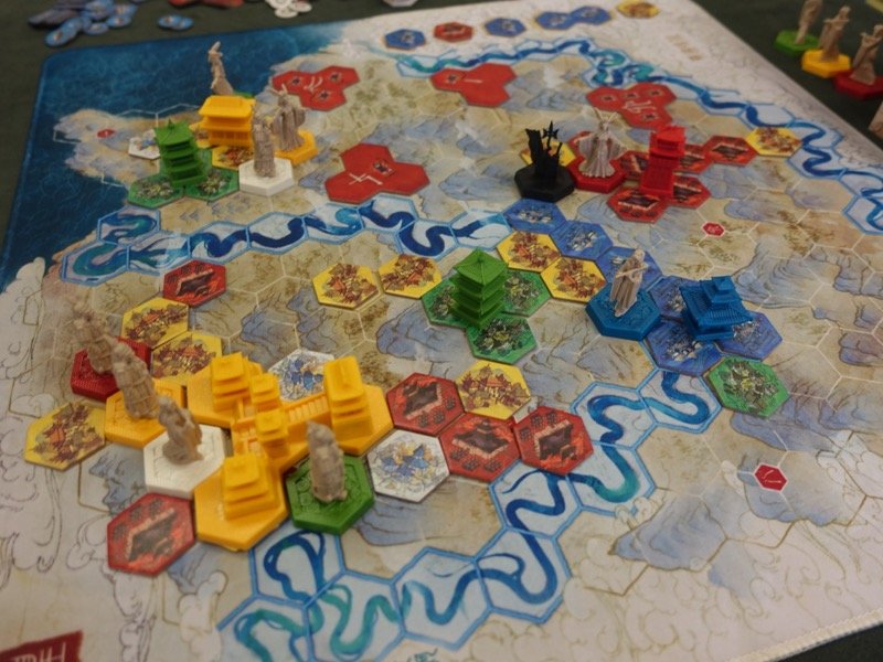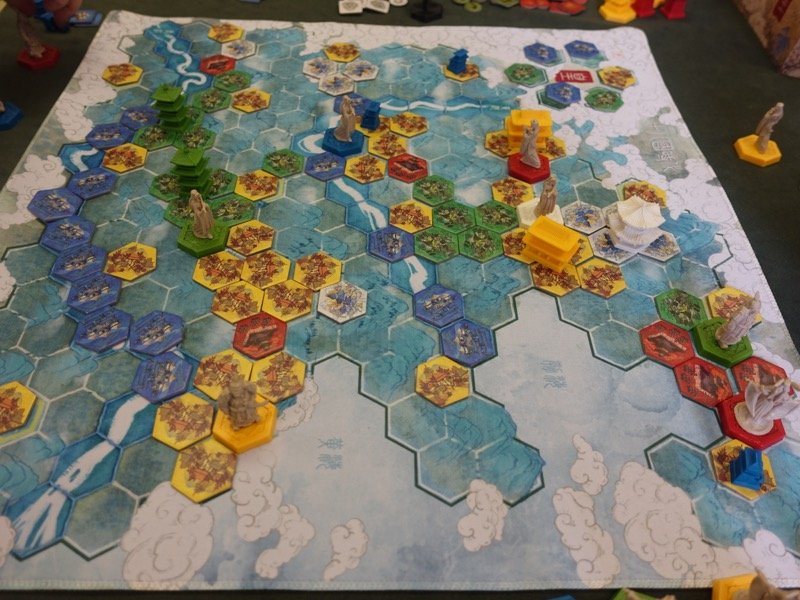 ぴーかんさんの主導で「皇(ハン)」を2回も遊びました。前から遊んでみたかった盗賊と十八王宮の拡張です。さらに王宮という4ヘックス分のモニュメントの拡張も使いました。これは黄色のモニュメントの1種で手札を1枚増やします。