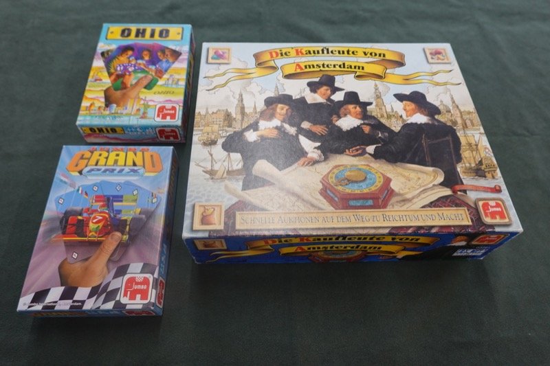 「オハイオ」と「ジャンボグランプリ」はどちらも1998年製の小箱のカードゲームで、現時点では再販/リメイクされていません。「オハイオ」は「古代ローマの新しいゲーム」の「スパルタカス」の製品化で、ルールが少し改変されています。全員同じ手札でシェディング系(ゴーアウト系)のような競りのような不思議なプレイ感です。「ジャンボグランプリ」はスート別の捨て札という翌年の「ロストシティ」に使われたシステムや、1枚捨てて2枚補充という「指輪物語二つの塔/セイミインザスーパークレイジーワールド」の原型となったシステムがあって興味深いゲームです。