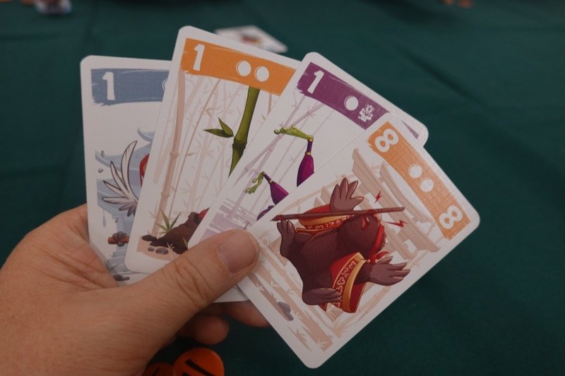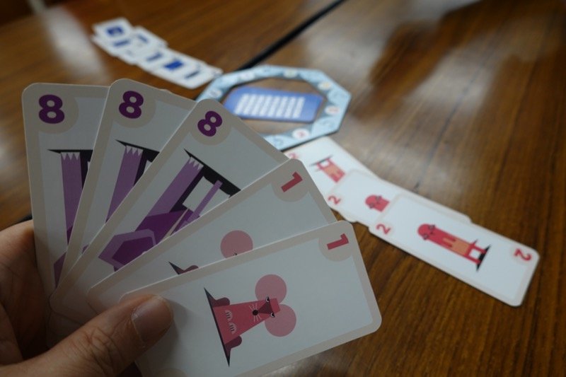 「ブラックシープ/まねきねこれくしょん」を簡略化したようなゲームです。しかし、これらのゲームでは1枚プレイしたときに1枚手札を捨てられたのですが、このゲームでは手札が一切捨てられないのが辛いです。