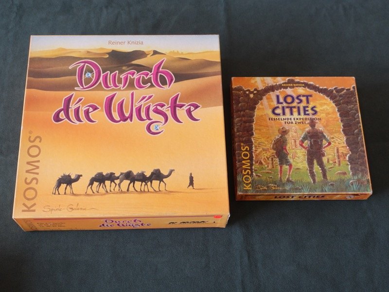 「ロストシティ」は「ショッテントッテン/バトルライン」と双璧をなす2人用カードゲームの傑作です。ここから派生したゲームは数多く、特に「ケルト」ではSdJを受賞しています。オフィシャルサイトでは2デッキ使って遊ぶ4人でのパートナーシップ(ペア戦)のルールがあり、第2版からしばらくはこのルールも記載されていました。写真は、昔ボール紙から作った携帯用の箱です。