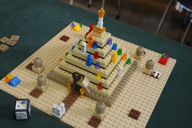 ぴーかんさんリクエストその3。一時流行ったレゴを使うゲームのひとつです。ルールの英語とドイツ語に相違点があって解読が大変でしたが、遊び始めるとどんどん移動する宝石の色を覚えるのが大変! さらにミイラが次々に降りてきます。ミイラを避けながらピラミッドの頂上を目指し、最後は宝石の場所を当てるチャレンジが待っています。河原さんが見事に勝利。