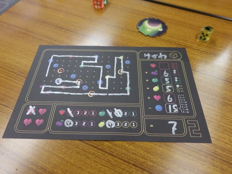 クニツィアの紙ペンでは一番好きな「スペースワーム」です。今回はスーパーフルーツがあるレベル2を遊びました。自分は首尾良く紫と黄色のフルーツを最初に通過し、さらに緑も2位だったので、それだけで16点を得たのですが、ゲームが思ったより早く終わってしまい惑星を5個も残してマイナス15点となり、結局7点と最下位タイでした。こんなに惑星を残してしまったのは初めて。