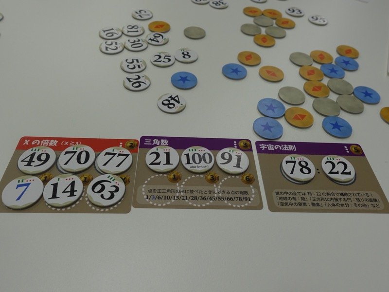 数字を使った同人ゲーム。1−100の数字チップが裏向きに並んでいて、手番ではそれらにチップを表にして獲得したり、目的カードを取ったりします。目的カードにはおける数字の条件が色々とあり、「メルセンヌ数」「フィボナッチ数」など結構マニアックなものもあります。ただゲームとしてはこの条件の煩雑さによって楽しさが削がれてしまうという感覚が強いです。相手もチップを取れるとか、もう少しゲーム性が高い方が良かったのではないでしょうか。