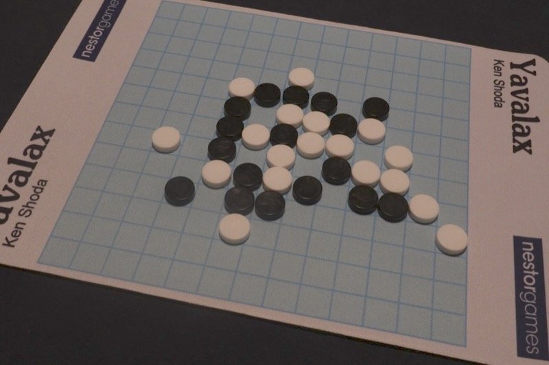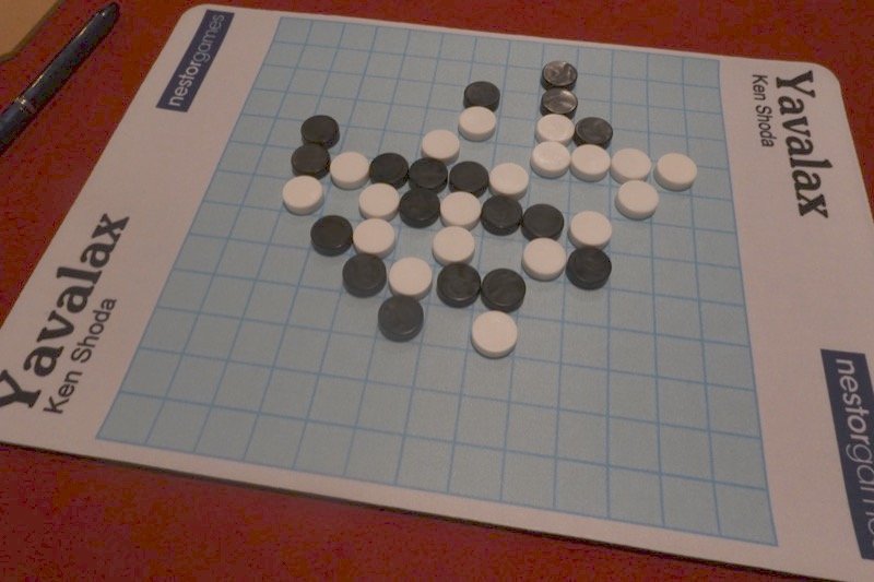 「ヤバラックス」はネスターゲームズから販売されていた5目並べの一種で、手番には2つのコマを順に置いて4連を同時に2つ以上作ることを目指すゲームです。先手の初手番だけは1つしか置けず、また4連1つや5連は禁じ手となります。